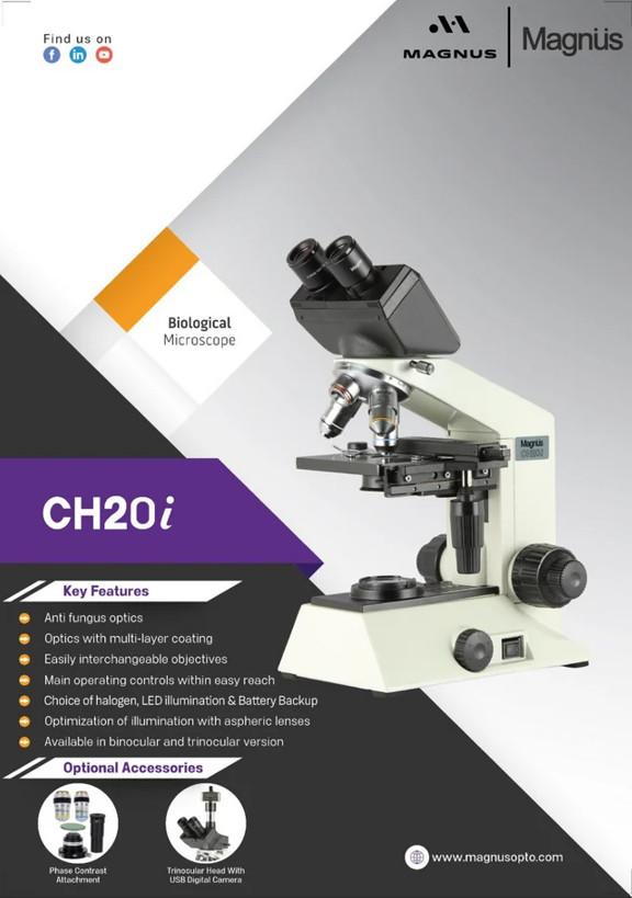 The Magnus CH20i is a Biological microscope designed for educational and routine laboratory use. It is known for its quality optics, ergonomic design, and user-friendly features.