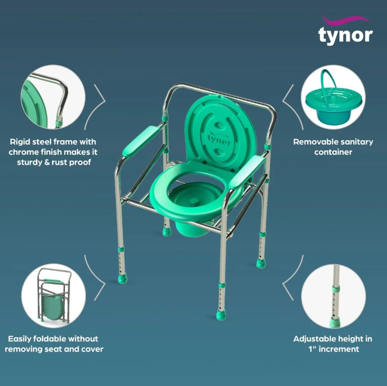 Tynor Commode Chair is a mobile toilet that can be placed next to patients who cannot cover the distance to the bathroom due to frailty, fracture, injury, or surgery. This aid helps maintain regular bowel discipline, which is extremely important during rehabilitation. In addition, the removable sanitary container and height adjustment feature ensures easy use and correct posture.