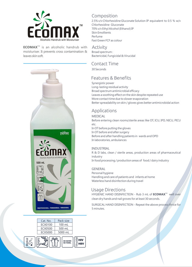 HYGIENIC HAND DISINFECTION — Rub 3 ml of ECOMAX well over clean dry hands and nail groves for at least 30 seconds. SURGICAL HAND DISINFECTION — Repeat the above process thrice for 5 minutes.
